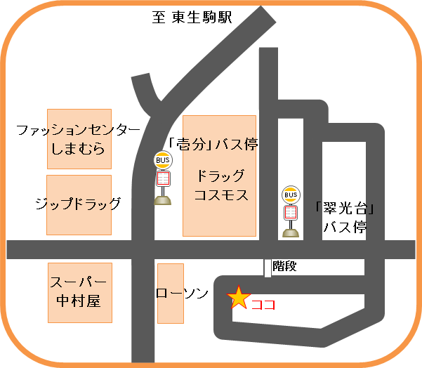 近鉄奈良線「東生駒」駅より ・奈良交通バス「小瀬保健福祉ゾーン行」にて約8分「壱分」下車 徒歩約2分 ・奈良交通バス「翠光台行」にて約8分「翠光台」下車 徒歩約1分